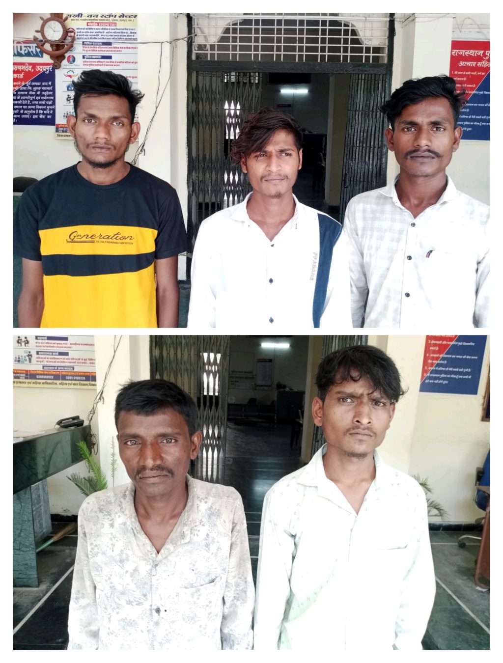 थानाधिकारी घनश्याम सिंह ने बताया की कार्यवाही करते हुए शांति भंग के आरोप में पांच अभियुक्त सतीश पिता नारायण मीणा उम्र 21 वर्ष निवासी काकरी डुंगरी थाणा गाव ऋषभदेव, विनोद पिता संग्राम मीणा उम्र 20 वर्ष निवासी काकरी डुंगरी थाणा गाव ऋषभदेव , धनराज पिता लालूराम् मीणा उम्र 19 वर्ष निवासी उपला मांडवा ऋषभदेव , सोहन पिता नाना मीणा उम्र 32 वर्ष निवासी कागदर बोबला फला ऋषभदेव, आशीष पिता दिनेश मीणा उम्र 21 वर्ष निवासी उगमना कोटडा थाना ऋषभदेव को गिरफ्तार किया है ।