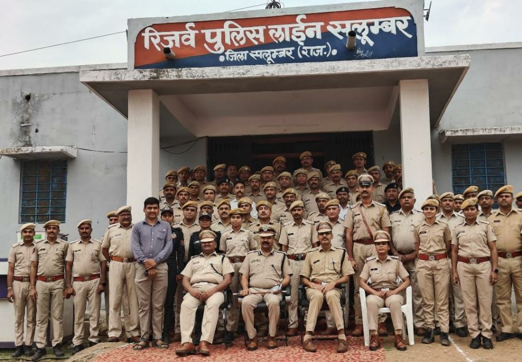सलूम्बर जिला ब्यूरो चीफ,नितेश पटेल । सलूम्बर जिले में सलूम्बर जिला पुलिस अधीक्षक अरशद अली एवं अतिरिक्त पुलिस अधीक्षक अशोक कुमार बुटोलिया व वृत्ताधिकारी वृत सराडा मदनलाल बिश्नोई,पुलिस निरीक्षक विना लोट व जिले के समस्त थानाधिकारी,कर्मचारीयों द्वारा बुधवार को रिजर्व पुलिस लाईन सलूम्बर में 75 वां राजस्थान पुलिस स्थापना दिवस 2024 को हर्षोल्लास से मनाया गया।जिसमें जवानो द्वारा सलामी दी गई।इस उपलक्ष्य में सभी को सम्बोधित किया गया।पुलिसकर्मियो से राजस्थान पुलिस की गौरवशाली परपंराओ को आगे बढाते हूये इसे सर्वोच्च शिखर पर ले जाने का आह्वान किया गया।छोटे-बडे सभी प्रकार के अपराधो पर निष्पक्ष एवं त्वरित कानूनी कार्यवाही करने,आम जनता के साथ अच्छा व्यवहार,बीट सिस्टम,कम्युनिटी पुलिसिंग और जन संपर्क के माध्यम से सूचना तंत्र को मजबुत कर भविष्य में होने वाली घटनाओ से निपटने के लिये पुरी तरह तैयार रहने का संदेश दिया। पुलिस परिवारो के बच्चों द्वारा सांस्कृतिक कार्यकम किये गये।तत्पश्चात् पुलिस लाईन परिसर में वृक्षारोपण कर पर्यावरण संरक्षण का संदेश दिया।
