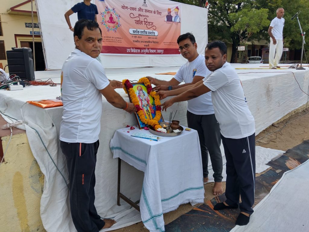 मावली,ओमप्रकाश सोनी । थीम के साथ दसवें अंतरराष्ट्रीय योग दिवस का ब्लॉक स्तरीय आयोजन राजकीय सीनियर सेकेंडरी स्कूल परिसर में आयोजित हुआ।कार्यक्रम में उपखण्ड अधिकारी मनसुख राम डामोर एवं विकास अधिकारी शैलेंद्र खींची ने भगवान धन्वंतरि को दीप प्रज्ज्वलित एवं माल्यार्पण कर किया। ब्लॉक आयुर्वेद चिकित्सा अधिकारी डॉ. रमेंद्र कुमार शर्मा ने योग के विषय में जानकारी दी,एवम मानसिक शारीरिक आध्यात्मिक विकास हेतु जीवन में योग का महत्व बताया।योग प्रशिक्षक ललित गुर्जर के नेतृत्व में योगप्रशिक्षक किशन लाल डांगी और योग प्रशिक्षिका बविता महात्मा ने सभी को प्रोटोकॉल के अनुसार योगाभ्यास कराया।कार्यक्रम में डॉ.चंद्र प्रकाश सिंह, नटवर लाल गुर्जर, मावली व्यापार मण्डल अध्यक्ष निर्मल कुमार लोढ़ा ,राकेश खटवड़, ब्लॉक शिक्षा अधिकारी प्रमोद कुमार सुधार समस्त ब्लॉक स्तरीय अधिकारी एवम राजकीय कर्मचारियों व नगरपालिका क्षेत्र मावली के महिला,पुरुष ब बच्चों ने योगाभ्यास किया। व्यापार मंडल मावली की ओर से फल व बिस्किट वितरित किए। विकास अधिकारी शैलेन्द्र खींची ने स्वास्थ्य के लिए सभी को योग से जुड़ने एवम नित्य योगाभ्यास करने का आहवान किया। उपखण्ड अधिकारी डामोर ने वर्तमान परपेक्ष्य में योग को अपनाना समय की मांग बताया एवम अधिक से अधिक नागरिकों को नित्य योगाभ्यास करने को कहा।