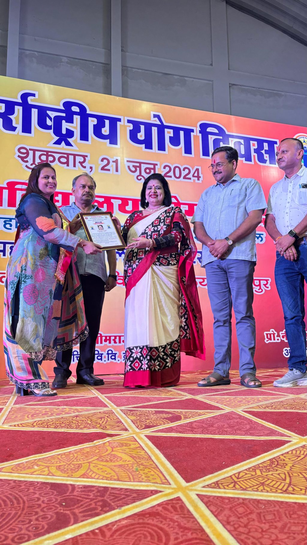 योग के क्षेत्र में उत्कृष्ट कार्य करने के उपलक्ष्य योग प्रशिक्षक मीना जैन बाबेल को सम्मानित किया