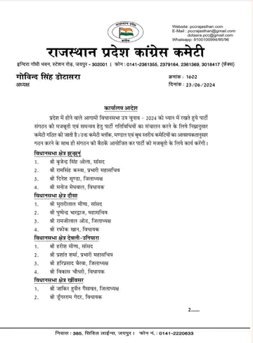 - दौसा सीट के लिए सांसद मुरारीलाल मीणा, महासचिव पुष्पेन्द्र भारद्वाज, जिलाध्यक्ष रामजीलाल ओड और विधायक रफीक खान को कमेटी में शामिल किया है।