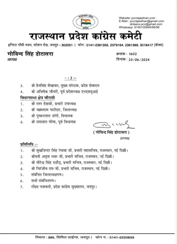 - झुंझुनूं सीट के लिए गठित कमेटी में सांसद बृजेन्द्र ओला, प्रभारी महासचिव राम सिंह कस्वां, जिलाध्यक्ष दिनेश सूंडा और विधायक मनोज मेघवाल को शामिल किया गया है।