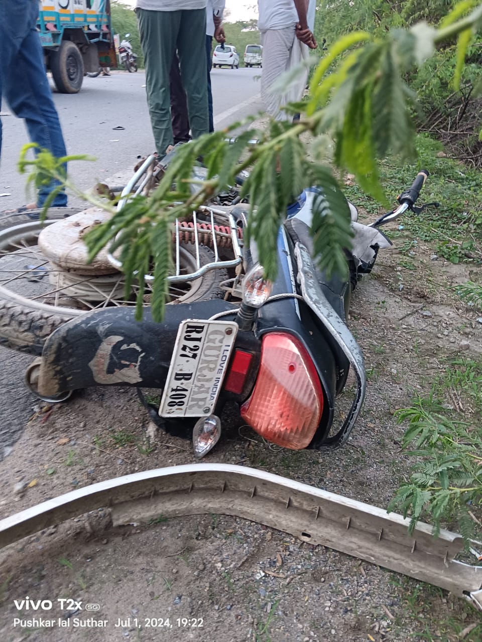 मावली,ओमप्रकाश सोनी । कस्बे के वल्लभनगर रोड स्थित अखाड़ा मंदिर के पास एक मोटरसाइकिल का पिकअप से एक्सीडेंट होने से मोटरसाइकिल सवार दो शिवलाल पिता रामजी गुर्जर उम्र 35 वर्ष निवासी फोजाबा का कुआं लोपड़ा, मनोहर सिंह पुत्र उदय सिंह जाति राजपूत उम्र 40 वर्ष निवासी लोपडा की मौके पर ही मृत्यु हो गई।