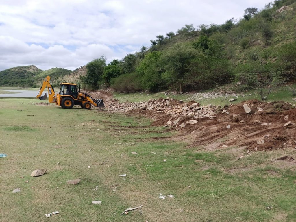 मावली,ओमप्रकाश सोनी । उपखंड क्षेत्र के ग्राम पंचायत विजनवास के ग्राम विकरणी के तालाब मैं दीवार बनाकर अतिक्रमण होने की शिकायत के बाद मंगलवार को जेसीबी मशीन से अवैध अतिक्रमण को ध्वस्त किया गया। ग्रामीणों द्वारा गत दिनों शिकायत की गई थी कि विकरणी तालाब के भराव क्षेत्र में कच्ची कोर्ट की दीवार बनाई जा रही है। शिकायत की जांच सही पाए जाने पर राजस्व टीम द्वारा तालाब के पेटे निर्माणधीन 687 वर्ग मीटर पत्थर की दीवार को जेसीबी से हटवाया गया। उक्त कार्रवाई के दौरान भू. अभी. नी. मदन सिंह राव, पटवारी मुकेश मीणा, पप्पू लाल डांगी उपस्थित रहे।