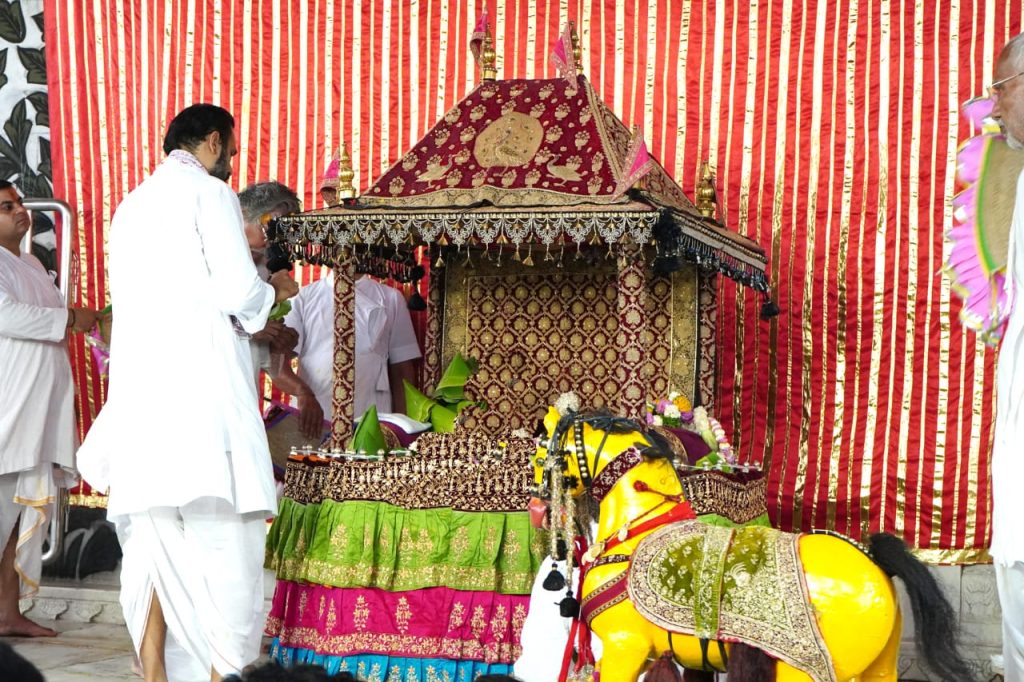 नाथद्वारा,नरेन्द्र पालीवाल । पुष्टीमार्गीय प्रधान पीठ प्रभु श्रीनाथ जी की हवेली के तिलकायत श्री के सुपुत्र युवाचार्य गो.चि.105 श्री विशाल जी (श्री भूपेश कुमार जी) बावा श्री ने दि.07/07/2024, रविवार को श्रीजी प्रभु में रथ यात्रा उत्सव के अवसर पर श्री विशाल बावा ने राजभोग के दर्शन में श्रीजी प्रभु के सम्मुख रथ यात्रा उत्सव के भाव से रथ को पधराकर रथ यात्रा उत्सव के भाव से सेवा की तथा श्रीजी प्रभु की आरती उतारी ज्ञातव्य है कि श्रीजी प्रभु के ठाड़े वस्त्र आज से प्रारंभ हो जाते हैं और श्रीजी प्रभु के उष्णकाल का समापन माना जाता है,तथा आज से श्रीजी सम्मुख फव्वारे की सेवा,छिड़काव और जल के थाल के पधराने की सेवा का समापन माना जाता है लेकिन ऋतु के अनुसार विवेकानुसार मुखिया जी के ऊपर निर्भर होता है कि वह पुनःठाड़े वस्त्र ठाकुर जी को धराएं या नहीं !राजभोग के दर्शन के समय श्री लाडले लाल प्रभु श्री नवनीत प्रिया जी को लालन के चबूतरे पर विराजित कर श्री विशाल बावा ने श्री लाडले लाल प्रभु को रथ में बिरजाकर स्वयं अपने करकमलों से रथ को खींचकर रथ यात्रा के भाव से रथ यात्रा उत्सव की सेवा की! एवं श्री लाडले लाल प्रभु की आरती उतारी! रथ यात्रा के विशेष अवसर पर श्री विशाल बावा ने श्रीजी प्रभु एवं लाडले लाल प्रभु को आम का भोग अरोगाया !