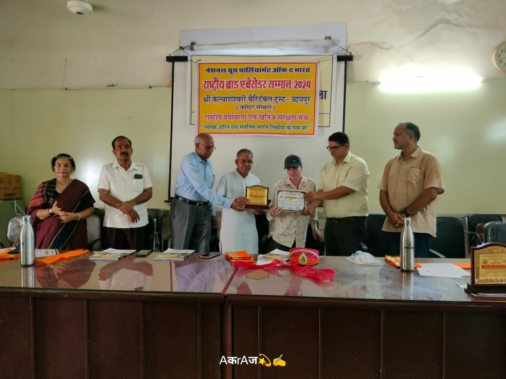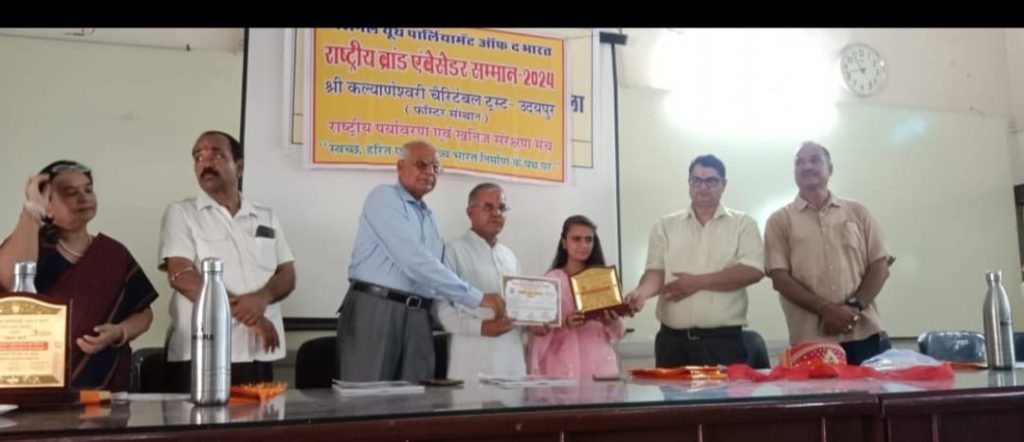 बांसडा,कन्हैयालाल मेनारिया । उदयपुर जिला मुख्यालय पर सहायक निदेशक कृषि विभाग सभागार में राष्ट्रीय ब्रांड एम्बेसडर सम्मान 2024 प्रदान किया गया यह सम्मान नेशनल यूथ पार्लियामेंट ओफ द भारत, श्री कल्याणेश्वरी चैरिटेबल ट्रस्ट उदयपुर एवं राष्ट्रीय पर्यावरण संरक्षण मंच मावली के संयुक्त तत्वावधान में भीण्डर के अम्बा लाल चौबीसा (सावन) शिक्षक एवं उनकी पुत्री पिनल चौबीसा को दिया गया । इसके सहित भारत के विभिन्न राज्यों से आए 105 से अधिक विभिन्न क्षेत्रों में सराहनीय कार्य सेवा देने वाले व्यक्तियों को भी सम्मानित किया गया।
