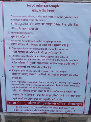 नए नियमों के तहत यहां दर्शन करने आने वाले भक्त छोटे कपड़े (मिनी स्कर्ट, बरमूडा) और नाइट सूट पहन कर दर्शन नहीं कर पाएंगे। वहीं मोबाइल ले जाने पर भी पाबंदी लगा दी गई है। उदयपुर से करीब 22 किलोमीटर दूर कैलाशपुरी गांव में एकलिंग जी मंदिर है। इन्हें मेवाड़ के आराध्य के तौर पर पूजा जाता है। मंदिर प्रबंधन की ओर से नए नियमों को लेकर बैनर शुक्रवार को परिसर में लगा दिया गया है।