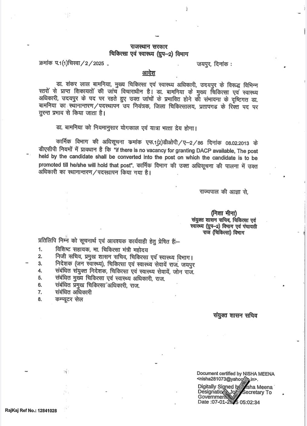 लगातार मिल रही शिकायतों के बाद उदयपुर CMHO बामनिया को हटाया,प्रतापगढ़ हुआ ट्रांसफर