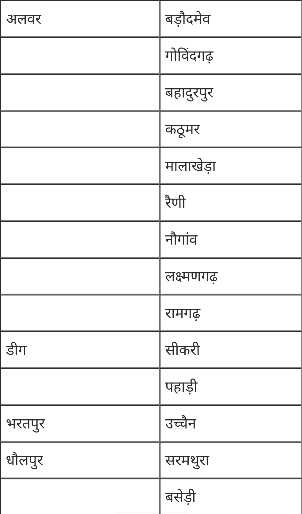- अलवर: बड़ौदमेव, गोविंदगढ़, बहादुरपुर, कठूमर, मालाखेड़ा, रैणी, नौगांव, लक्ष्मणगढ़, रामगढ़