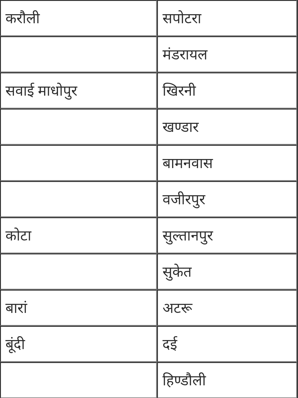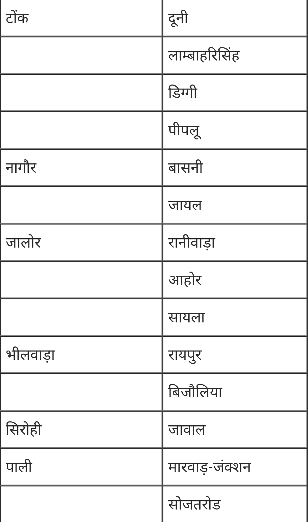 - टोंक: दूनी, लाम्बाहरिसिंह, डिग्गी, पीपलू