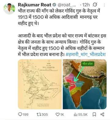 राजकुमार रोत ने इससे पहले पोस्ट किया है कि भील राज्य की माँग को लेकर गोविंद गुरु के नेतृत्व में 1913 में 1500 से अधिक आदिवासी मानगढ़ पर शहीद हुए थे।
