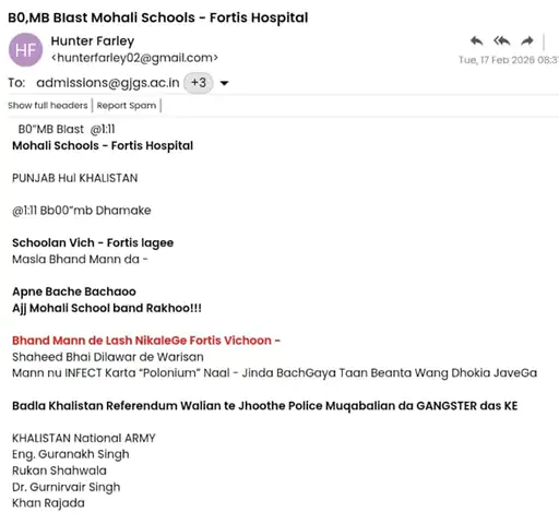 हंटर फार्ले के नाम से जीमेल के जरिए भेजी ई-मेल में पंजाब को खालिस्तान बताते हुए कहा गया है अपने बच्चे बचा लो और मोहाली के स्कूल बंद रखो।